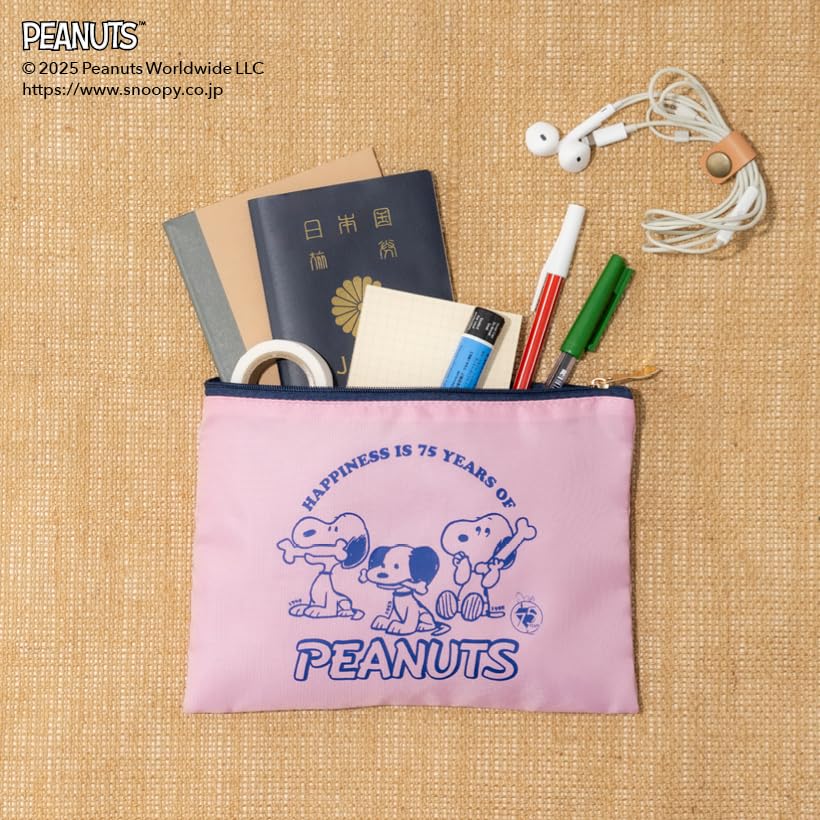 ポーチに描かれた歴代スヌーピーたちが大集合した限定アート入り。