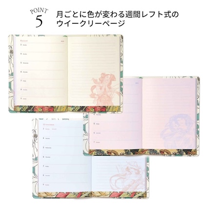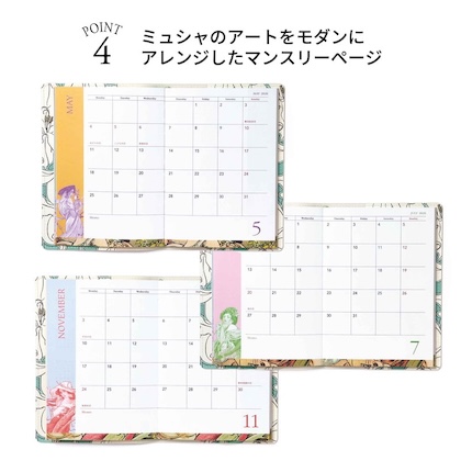 マンスリーページは、ミュシャのアートをベースにしたモダンでカラフルなデザイン。