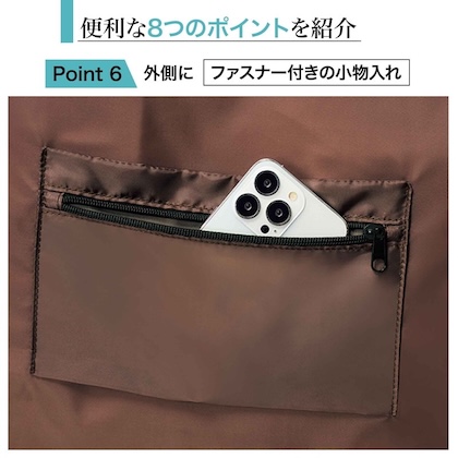 スマホや小物が入れられるファスナー付きポケットもあり、細かいところまで気が利いてます。