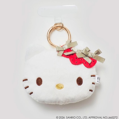 いちごぬいぐるみチャームは、キティフェイスに、いちごモチーフとリボンをちょこんと添えた、可愛すぎるデザイン。