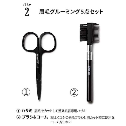 中には、眉専用ハサミやブラシ&コーム、毛抜き、Wエンドのスクリューブラシ&平筆、さらに折りたたみシェーバーまで揃った豪華ラインナップ。